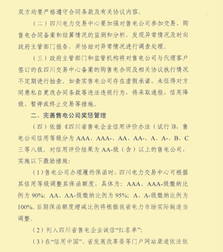 根據(jù)四川省發(fā)改委,四川省能源局發(fā)布的一則《關于進一步加強四川省售電公司運營管理有關工作》的通知,為規(guī)范售電市場交易,鼓勵售電公司誠信經(jīng)驗,給出了一系列的管理辦法和獎懲制度。